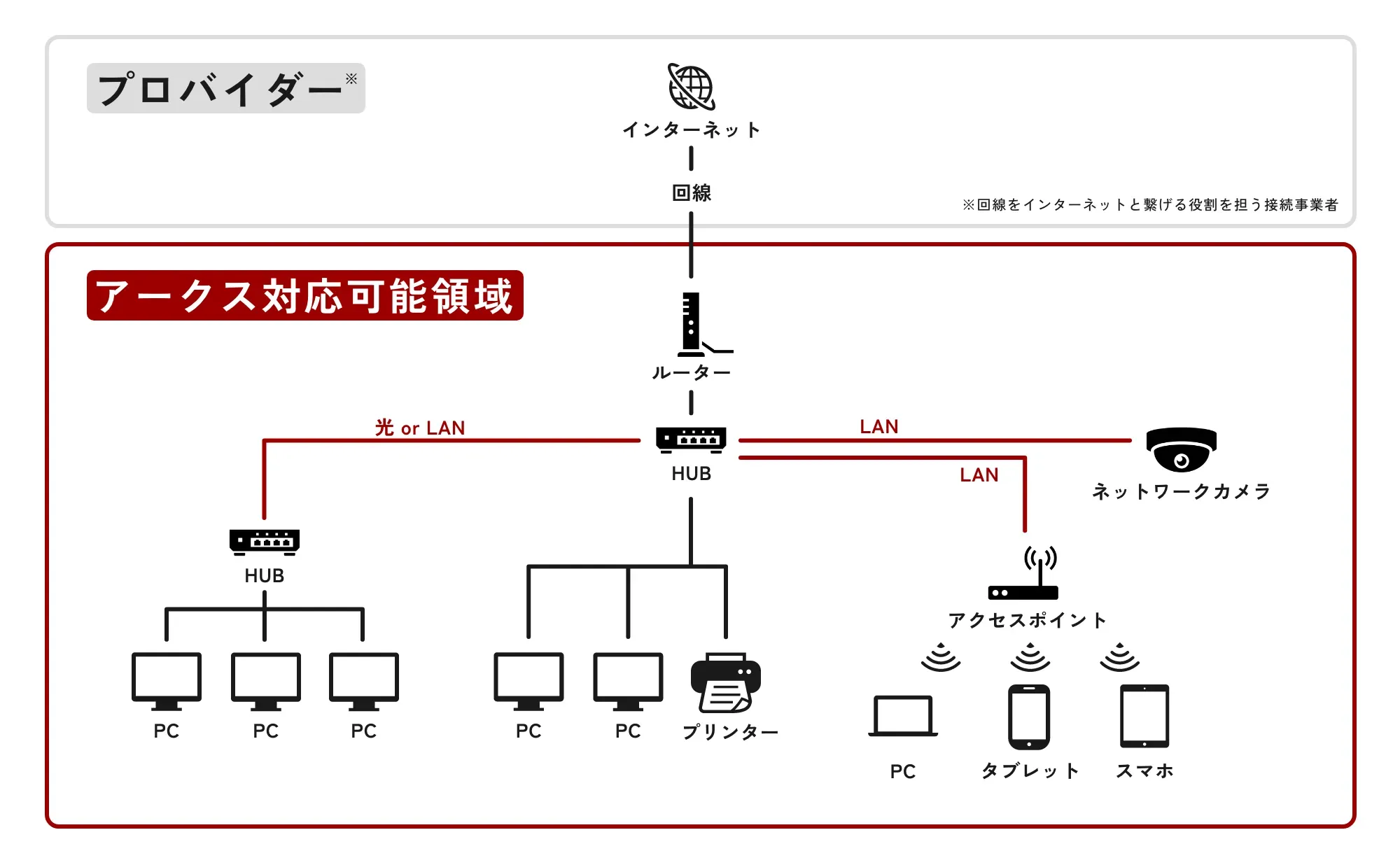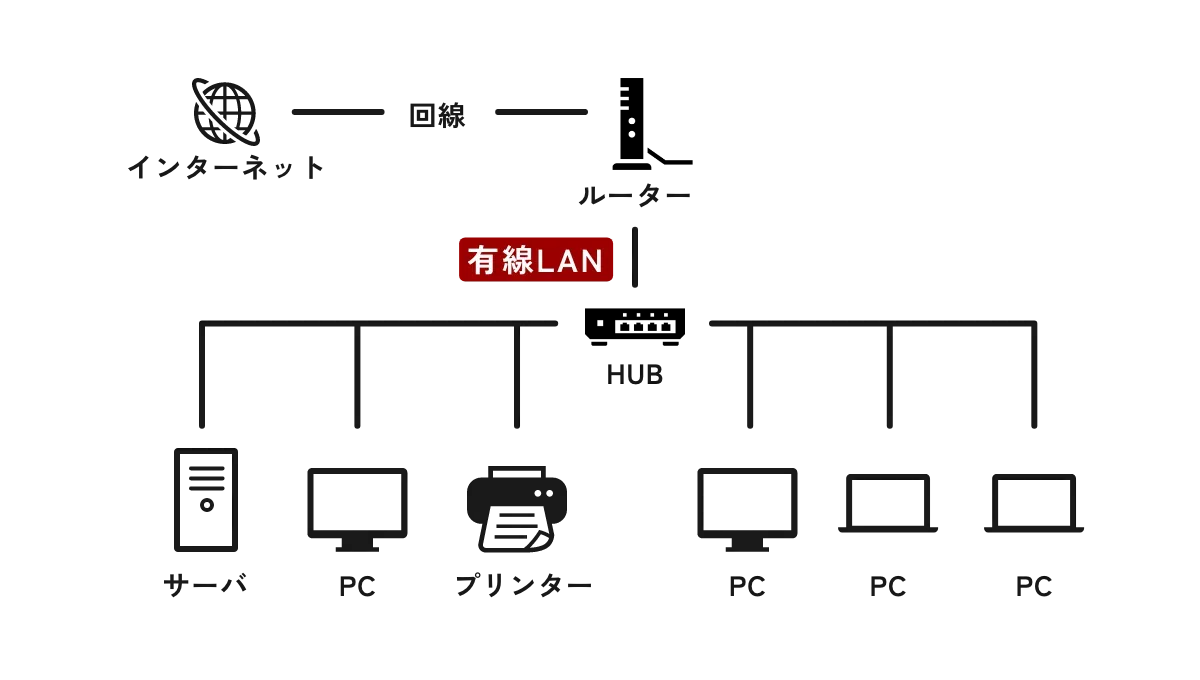 LANケーブル(有線)を用いた安定性や高速通信に優れたネットワーク構築方法です。