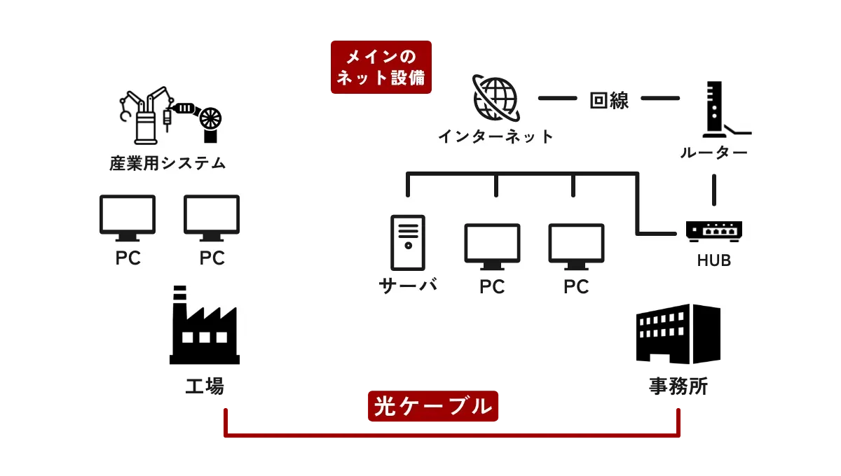 長距離でもノイズの影響を受けず、高品質で高速通信。強い耐久性を持ち、落雷に強いのが特徴です。広い敷地の工場や倉庫でネットワークを構築したい、新しい建物でネットワークを構築したい、といったご要望に対してオススメです。
