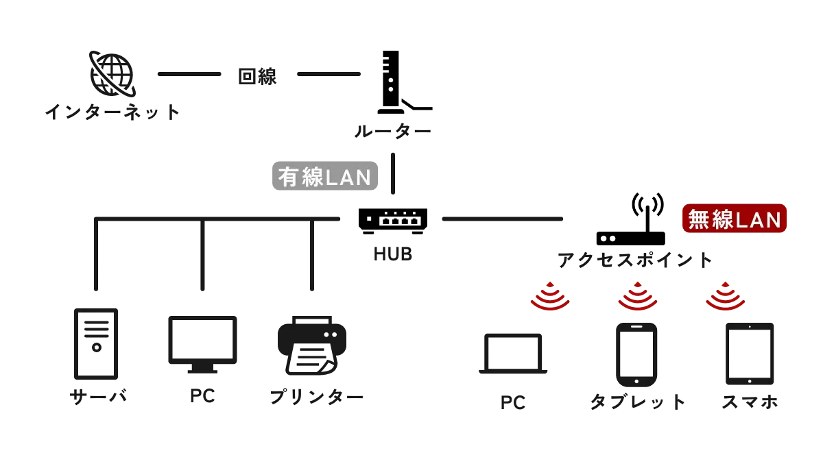 LANケーブルを使わず電波を使用しエリア内を無線接続するネットワーク構築方法です。