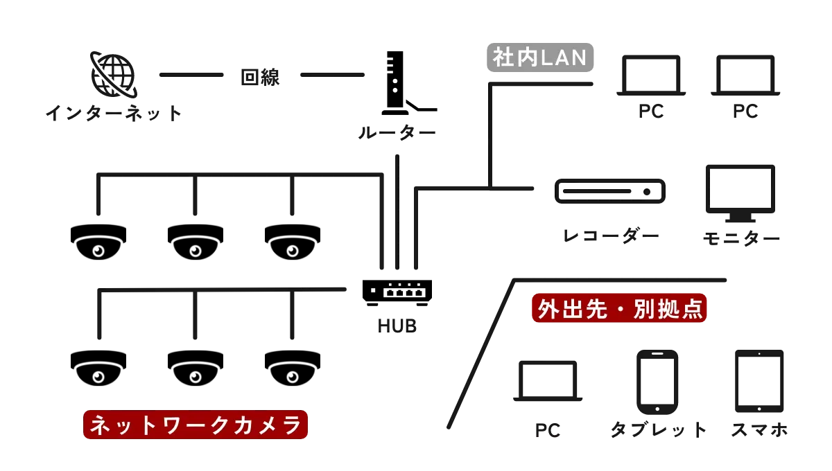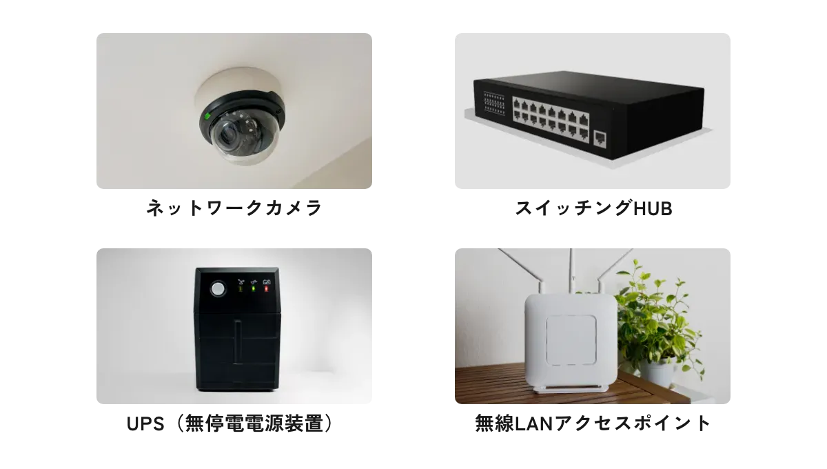 無線LANアクセスポイント、ネットワークカメラ、UPS(無停電電源装置)、スイッチングHUB、サーバーラック等